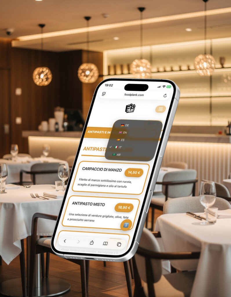 Unsere spezialisierte Gastronomie-KI erfasst jedes Detail deiner Karte mit höchster Präzision. Parallel wird dein Angebot in 20 Weltsprachen übersetzt – fachgerecht und kulinarisch präzise. Über dein Dashboard steuerst du mit einem Klick, welche Sprachen du deinen internationalen Gästen live anbieten möchtest.